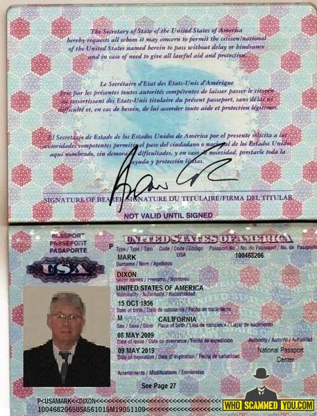 He posts stolen photographs and a copy of a stolen USA Passport of "Mark Dixon". He pretends to have a son, Harry, a medical student. His "lawyer" is Dr Martins Asare, who manages his late father's trust in Accra Ghana. He is ruthless, and manipulative liar and thief. Pretends he is an off-shore engineer working on an oil rig. African accent, probably Ghanian. Uses names such as "Eric Carter", "Allen Reynolds", Mawell Adewale.